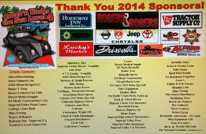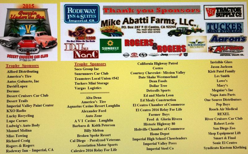 Roy & Megs Smith from Colorado, Walter Brinnon from Prescott Az, and Moritz from Avondale, Az, our wonderful Sponsors, Award Sponsors, the fabulous DJ Mark Reynolds, Reach, Relay For Life of Calexico, Ca for a great breakfast, all who helped so much; Steve and Rosalie Mercado, Richard Craig, Ana Carrillo and Gabriel, Norma and Jason Cosio, Barbara Peterson, Jerry and Susan Tucker, Pauline Shores, Dolores, Susana Vargas and friend, Miranda Family, Eric Perez, Imperial Cheerleaders, Lou and Sharon Theones, Russell with 'no thank you', Chuck and Sue Braden THANK YOU !!! A very special THANK YOU to the Rodeway Inn in Imperial and